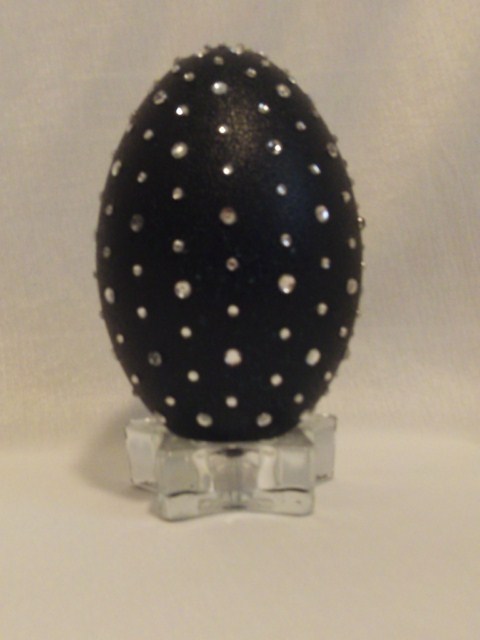 This emu egg is symmetrically decorated with cut glass gemstones that glisten under the spotlight.